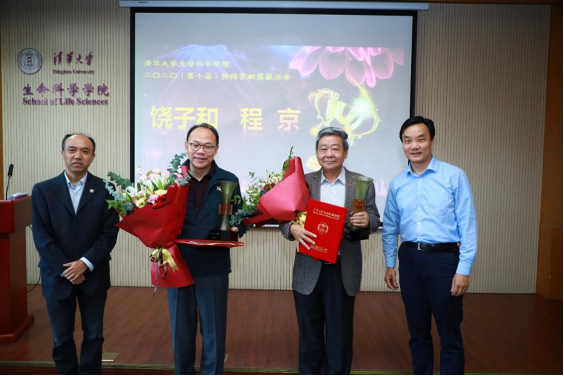 会上首先颁发的是生命学院特殊贡献奖。院长王宏伟宣读了颁奖词,并介绍了两位获奖人在90年代末学成归国,在生物系当时艰苦的条件下组建团队、开拓资源的励志故事以及他们分别在生物物理和国内生物芯片领域做出的重要贡献,王宏伟提到,两位获奖人对当时生物系的科研攻关、人才培养都发挥了关键的作用。紧接着,王宏伟和学院党委书记吴畏为获得第10届特殊贡献奖的饶子和院士和程京院士颁发了奖杯和证书。在两位获奖者的获奖感言中,饶子和院士首先分享了感恩和感激,他结合自己多年来在冠状病毒领域的科研经历,鼓励年轻学者要专注学术,要有国际视野,勇攀科技高峰。程京院士先是分享了自己从英国回到生物系的小故事及自己和生物系的深厚感情,他结合自己在SARS和冠状病毒中的抗疫经历,鼓励大家胸怀天下,为清华生命科学和医学发展竭尽全力做出贡献。