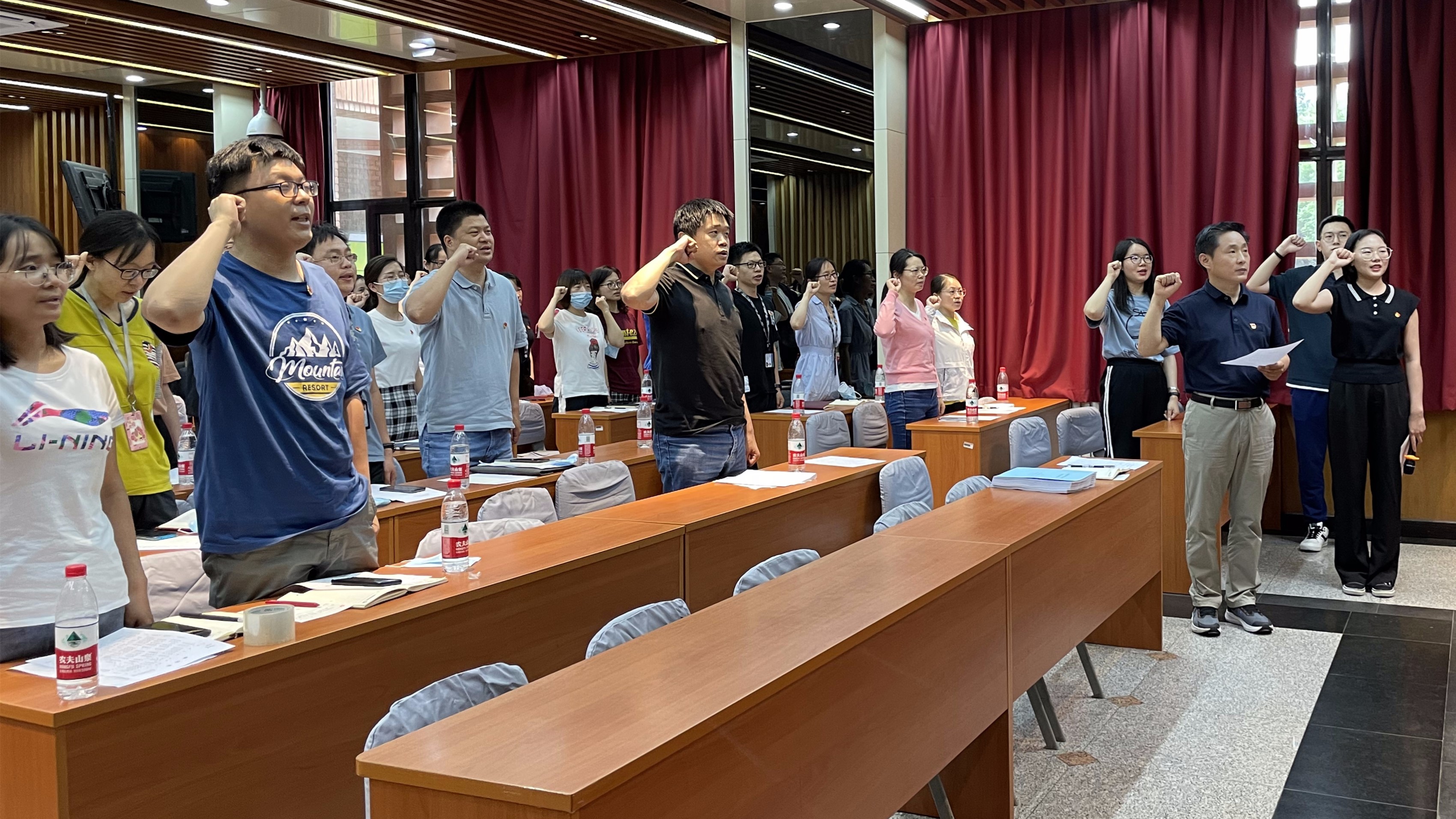 在生命学院教职工第四党支部书记谢忠忱老师领誓下,全体与会师生面向党旗宣誓,重温对党庄严而神圣的誓言。
